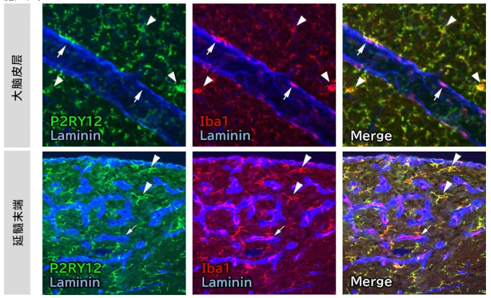 P2RY12(也稱(chēng)為P2Y12)是一種腺苷5'-二磷酸(ADP)受體,也是嘌呤能G蛋白偶聯(lián)受體P2Y家族的成員。它在外周組織的血小板中表達(dá),也在中樞神經(jīng)系統(tǒng)的穩(wěn)態(tài)小膠質(zhì)細(xì)胞(Homeostatic Microglia)中特異性表達(dá)。由于P2RY12幾乎不在巨噬細(xì)胞中表達(dá),所以它是用于區(qū)分存在腦血管周?chē)木奘杉?xì)胞和小膠質(zhì)細(xì)胞的有效標(biāo)志物1)。此外,ADP可用作細(xì)胞損傷的信號(hào),小膠質(zhì)細(xì)胞中的P2RY12被認(rèn)為在接收神經(jīng)細(xì)胞損傷方面發(fā)揮作用。