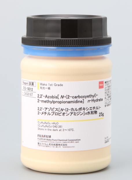 本產(chǎn)品為水溶性偶氮聚合引發(fā)劑。別名:偶氮二羧乙基-2-異丁基脒水合物。2,2'-Azobis[N-(2-carboxyethyl)-2-methylpropionamidine] n-Hydrate(引用文獻(xiàn):和光純藥情報(bào))