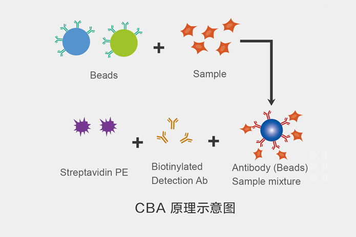 包被細(xì)胞因子特異性抗體的熒光磁性微球與待測(cè)樣本孵育,可與樣本中相應(yīng)的細(xì)胞因子特異性結(jié)合,加入生物素標(biāo)記的檢測(cè)抗體后,形成抗體包被微球-細(xì)胞因子-檢測(cè)抗體的免疫復(fù)合物;最后加入SAV-PE,通過(guò)流式細(xì)胞儀檢測(cè),熒光強(qiáng)度與樣本中細(xì)胞因子的含量成正比,最后結(jié)合細(xì)胞因子標(biāo)準(zhǔn)品的標(biāo)準(zhǔn)曲線,從而實(shí)現(xiàn)對(duì)同一份樣本中細(xì)胞因子的定量檢測(cè)。