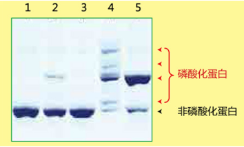 Phos-tag? SDS-PAGE 操作簡(jiǎn)單,只需在常規(guī) SDS-PAGE 膠中加入 Phos-tag? Acrylamide 和 Mn2+ 或者 Zn2+ 即可進(jìn)行實(shí)驗(yàn)。在電泳過程中,磷酸化蛋白的磷酸基團(tuán)與 Phos-tag? 中的二價(jià)金屬離子相結(jié)合,降低其遷移速度,從而可區(qū)分磷酸化與非磷酸化蛋白。