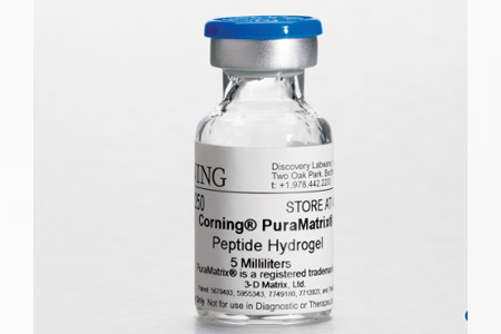 • Corning? PuraMatrix? Peptide Hydrogel is a synthetic matrix used to create defined three dimensional (3D) micro-environments for a variety of cell culture experiments. To achieve optimal cell growth and differentiation, it is necessary to determine the appropriate mixture of this material and bioactive molecules (e.g., growth factors, extracellular matrix (ECM) proteins, and/or other molecules). Corning PuraMatrix Peptide Hydrogel consists of standard amino acids (1% w/v) and 99% water. Under physiological conditions, the peptide component self-assembles into a 3D hydrogel with a nanometer-scale fibrous structure. The hydrogel is readily formed in a Falcon culture dish, plate, or cell culture insert.